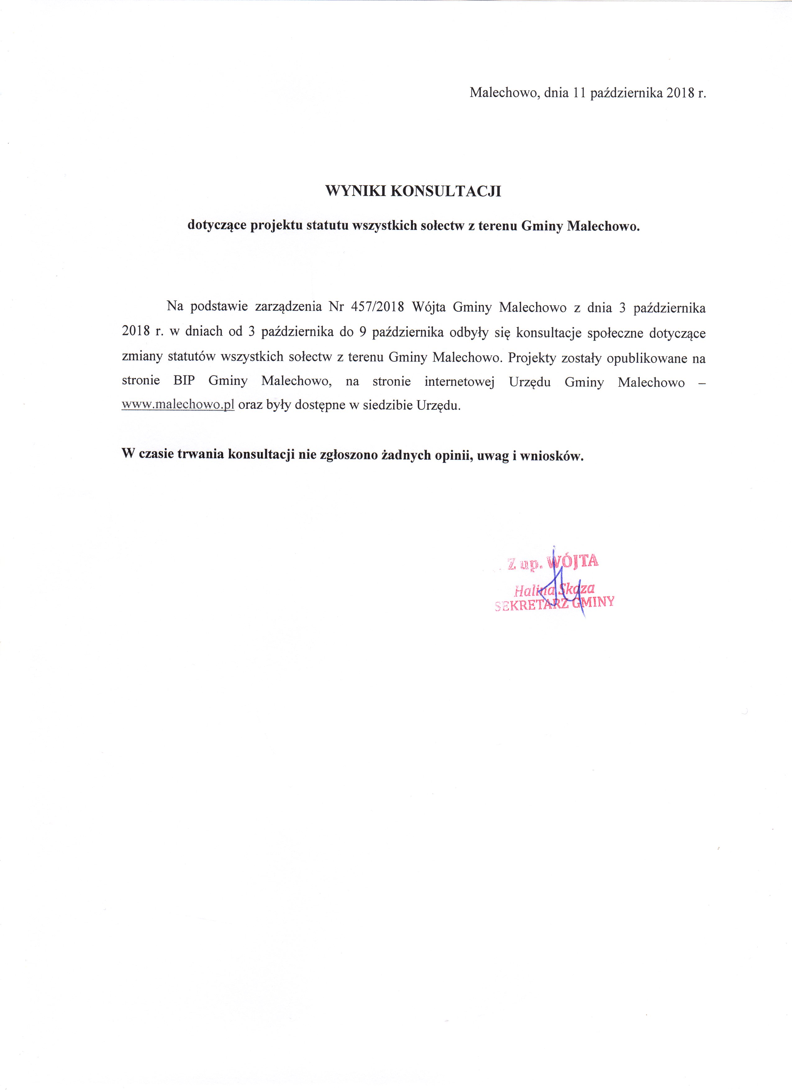 Zarządzenie Nr 457/2018 Wójta Gminy Malechowo z dnia 3 października 2018r. w sprawie przeprowadzenia konsultacji społecznych dotyczących zmiany statutów wszystkich sołectw gminy Malechowo.